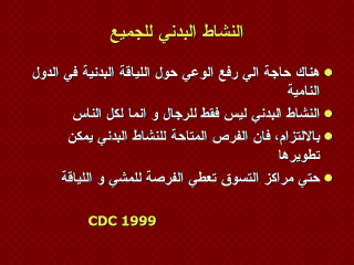 هناك الكثير من الفرص المتاحة للنساء في بيئتنا في الدول النامية تدعم النشاط البدني. المطلوب هو رفع الوعي و الرغبة في فعل ذلك. حتي مراكز التسوق تمنح فرصة للمشي و اللياقة.