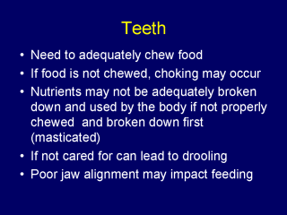 crucial to the digestion and processing of nutrients 2. If food is not chewed, choking can occur which in some cases may lead to aspiration of the food (entrance of food into the lungs) which in some cases may lead to pneumonia or death. (We’ll talk in more detail on this later) 3. Drooling may be a side effect of poor dental care: in severe cases may lead to social isolation, depression, transmission of disease, facial chapping (Refer to chapter in Arvedson and Brodsky Pediatric Swallowing and Feeding 1983) 4. Poor jaw alignment may impact feeding: comfort with textures, ability to properly masticate food, etc... |