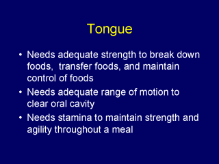 tongue, noting what it is doing, how it is moving, etc... -Now repeat this exercise and pretend that your tongue does not work right, maybe does not move up and down or side to side or just lies there. -WHAT HAPPENED? -Problems: Swallow food whole or with little breakdown Food may get caught in sides of mouth and can’t be retrieved Food may get pushed out of the front of the mouth (lose nutrients) -Now review notes on tongue from slide. These important things that the tongue must do translate into goals that therapists work on to improve nutrition and swallowing: increase strength, range of motion, stamina to maintain function throughout a meal, increase ability to clear oral cavity, and decrease loss of food and nutrients |