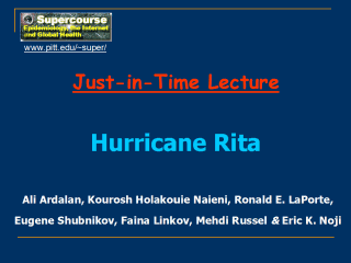 Disaster Network (GHDN) to the affected communities by Hurricane Rita. Please send the messages to "aardalan@gmail.com" and "Ronlaporte@aol.com". It would be great to have you involved. Authors: Ali Ardalan, MD, MPH, Ph.D. Health in Emergency & Disaster Division Institute of Public Health Research School of Public Health & Institute of Public Health Research Tehran University of Medical Sciences Tehran, Iran Kourosh Holakouie Naieni MPH, Ph.D. Institute of Public Health Research School of Public Health & Institute of Public Health Research Tehran University of Medical Sciences Tehran, Iran Ronald E. LaPorte, Ph.D. Professor of Epidemiology Director, Disease Monitoring and Telecommunications, WHO Collaborating Centre Graduate School of Public Health University of Pittsburgh USA Eugene Shubnikov, MD Senior Research Fellow Institute of Internal Medicine Novosibirsk City, Russia Faina Linkov, M.P.H. Research Assistant Department of Epidemiology University of Pittsburgh Pittsburgh, PA 15261 USA Mehdi Russel MD, MBA, Ph.D. General Secretariat of Health Risk Management & Emergencies Ministry of Health & Medical Education Iran Eric K Noji, MD, MPH Senior Advisor to the Director Office of Emergency Preparedness & Response (NCEH/ATSDR) Centers for Disease Control (CDC) USA |