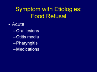 thrush, herpes sores. Also look for caries, gum inflammation, burns, lacerations. Pharyngitis: typical “red throat”, sore throat. Medications: may cause nausea, decrease appetite depending on medication. Ritalin for example can decrease appetite. |