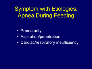 infants may experience apnea during feedings. Clues to aspiration/penetration are upper respiratory infections, cough, choking during feedings.