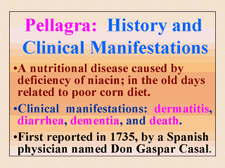 is a B-complex vitamin; and the amino acid tryptophan is its precursor. Clinical manifestations of pellagra involve the symptoms of 4 Ds: dermatitis, diarrhea, dementia, and death. In pellagrins (patients with pellagra), skin lesions resemble burned areas and hence become much more painful when exposed to sunlight. Although the skin lesions occur most often on exposed areas of the body (such as face, neck, forearms, and lower legs), stomatitis (inflammation of mouth) involving a swelling and reddening of the tongue is as common. Diarrhea is usually the result of gastrointestinal disturbances. In severe cases, neurological change could occur leading to serious disorientation and dementia. In the old days, fatal cases were quite common. Historically, pellagra was not recognized until around 1720, after the introduction of corn (maize) as a food commodity. There was supposition that as far back as during the pre-Columbian New World times, some pellagra-like incidents were experienced by people in Egypt and India living on Sorghum vulgare. Yet according to Roe (1973), author of the book A Plague of Corn - The Social History of Pellagra, no real evidence was available to support such a contention. There was documentation, however, showing that pellagra was first observed in the Asturia in Europe in 1735, by a Spanish physician named Don Gaspar Casal. At that time, pellagra was referred to as Mal de la Rosa. |