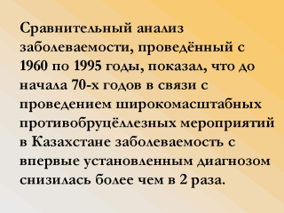 | Однако в дальнейшем просчёты ветеринарной службы с планированием и проведением прививок животных в сочетании с нарушением других санитарно-ветеринарных мер борьбы с источником инфекции, способствовали обострению эпизоотолого-эпидемиологической обстановки, росту заболеваемости людей к 1995 году почти в 8 раз. |