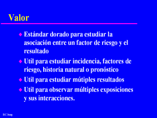 explicativos pueden ser factores de riesgo o factores pronósticos. Estos estudios son costosos y toman tiempo así que las enfermedades estudiadas no deberán ser raras. O la enfermedad debería tener un elevado riesgo atribuible. Riesgo atribuible es la diferencia entre dos proporciones. Cuantifica el número de ocurrencias de un resultado de salud que es debido a, o atribuido a, la exposición o factor de riesgo. Es usado para evaluar el impacto de eliminar un factor de riesgo. |