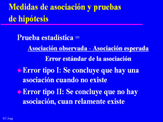 Asociaciones observadas y la prueba estadística usadas para evaluarlas y seguir conocidas distribuciones de probabilidad. Valores críticos pueden ser elegidos para evaluar la probabilidad de que las asociaciones observadas ews diferente de sus valores esperados. La probabilidad de interpretación de una asociación observada como real cuando es de verdad debida al azar, o a la probabilidad de cometer un error tipo I, reportado como el valor de p.