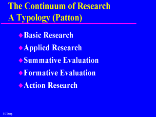 which I will go into more detail in a little bit. This scheme does explain the different approaches researchers can take in studying phenomena, and actually helps to explain the various research and evaluative studies conducted in Public Health. In fact, if you view Public Health as an applied science, then you can see why conducting basic research may not always be the best approach to studying phenomena in the field of Public Health. Certainly, the world is not a laboratory, and there are limits to human experimentation. You can probably say epidemiologists are astute observers of phenomena, and their systematic observations are the basis of such public health research as observational studies. So, I find Patton’s scheme to be useful in capturing the various studies that can be conducted to deal with a specific public health problem. This typology is organized from the most rigorous to the least rigorous. This is not to say action research is less valuable than basic research, only that it may not be as formal, or structured as basic research, and its findings may not be generalizable beyond the study itself as basic research strives to be. I would think that all Public Health Practitioners can conduct action research in their work, and probably should. |