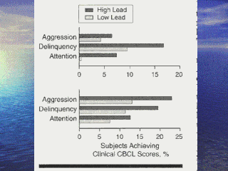 | We studied a group of first and second grade children in the Pittsburgh Schools. We measured lead in their bones by Xray fluorescence, and their behavior by a widely used inventory: the Child Behavioral Inventory. |