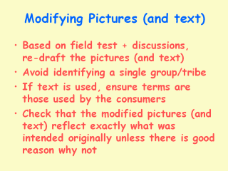 picture, later. Terminology is important, which is one reason why the technical ministry should normally not be involved. They usually insist on the accurate medical term – which is unlikely to be understood by the community. The recorder of the comments made when showing the pictures to the consumers, should be careful always to use the exact words used by the respondents, for these are the terms used in the community. In a mixed society (where two tribes co-exist, for instance), it is important that whoever is portrayed in the picture is not identifiable as coming from one or other of the groups, or the other group will reject the advice as being applicable only to the group shown. |