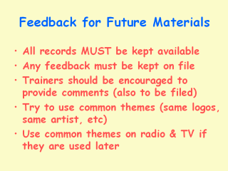 on file helps to avoid making the same mistakes again. The idea of common themes is important if public credibility is to be maintained. If you meet the same materials at school and in the clinic and at home, one is likely to think that all materials come from the same source, and if the logo (or whatever common theme is chosen) appears on all health materials, when one sees a new poster with the logo, one is more inclined to read it. Having the same artist for a wide range of themes also helps to enhance credibility. One trick to link health messages is where multiple media are used, if an established poster is seen on the wall in a TV message, here is a link. If a radio drama (or message) is used, then if mention is made about “those ORT posters”, another link is made. And so on. |