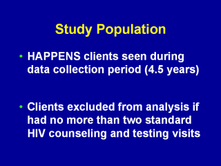 | The study population included HAPPENS clients seen during a four and a half year data collection period from 1994 to 1998. Because we were interested in predictors of longer-term retention in care, those clients who had no more than the two standard HIV counseling and testing visits were excluded from our analyses. |