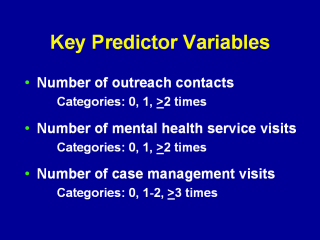 management, and mental health services. We collapsed data into three categories for each of these variables because of their highly skewed frequency distributions and because initial survival analysis results indicated possible threshold levels for increased retention. |