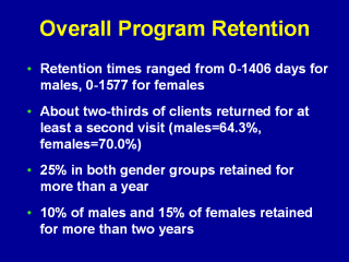 | Retention times were found to range from 0 to 1406 days among males, and up to 1577 days among females. About two-thirds of both male and female clients had at least two visits, and a quarter were retained for more than a year. 10% of males and 15% of females were retained for more than two years. |