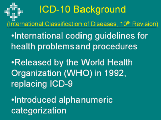 The International Classification of Diseases, 10th Revision has already replaced ICD-9 in many countries, including Canada, Australia, and Switzerland. However, there has yet to be extensive research validating the new codes or using data containing ICD-10 codes. For more information and codes go to http://www.who.int/classifications/icd/en/ |