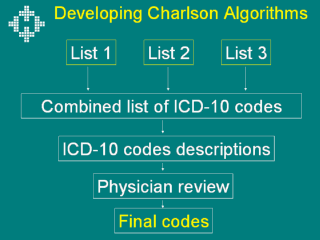 Following completion of all three lists, they were combined to form a comprehensive list of codes. This final list was reviewed by four physicians who came to a consensus regarding the list's compatibility with Charlson's clinical definitions of the comorbidities. Validation of the final list has yet to be done. |