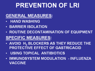 | RISK REDUCTION OF PNEUMONIAS: Hand washing during patient care and after glove removal Change gloves after coming into contact with respiratory secretions, in between patients Change tubing, masks and suction catheters between patients Anti-stress ulcer prophylaxis with sucralfate Early enteral feeding Elevate head end of patient to a 30 to 45 degree angle Prevention of atelectasis No routine antimicrobial prophylaxis |