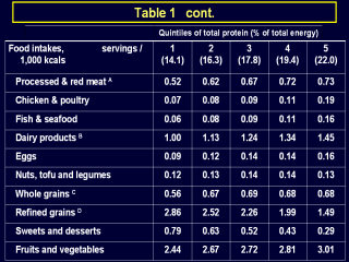kcals, Increasing protein intake was positively associated with servings of red meat, poultry, fish, dairy products and eggs, and inversely associated with servings of refined grains [specifically white bread] and sweets and desserts. Weak or modest associations were observed with servings of nuts/tofu/legumes, whole grains, and fruits and vegetables. |
