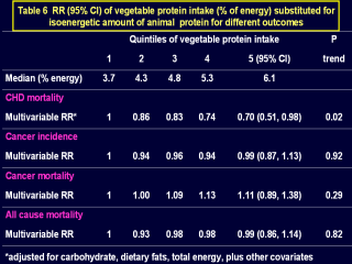 following a vegetarian diet) Only the association with CHD mortality was statistically significant, and resulted in a 30% decreased risk among women in the highest compared to lowest category of vegetable protein intake, representing a substitution of 2.4% of total energy from vegetable for animal protein (95% CI, 0.51-0.98; P for trend, 0.02). While the use of nutrient values was necessary to evaluate our hypotheses of protein for carbohydrate substitutions on various outcomes, realistically most individuals interchange foods when implementing dietary changes. Therefore, we also examined the association of different food sources of protein in place of carbohydrate-rich foods, standardized as servings per 1,000 calories, while holding constant total energy, dietary fats and other covariates. |