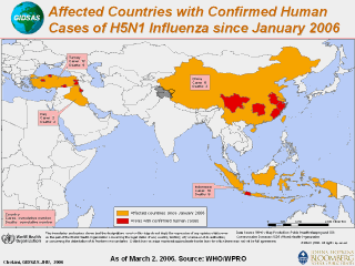2003. This slide shows the affected countries and areas where confirmed human cases have been documented since 2006. The difference that needs to be understood is that in 2006 the disease spread to Turkey and Iraq. Furthermore, new cases were seen in China and Indonesia. The map is dated March 2, 2006. |