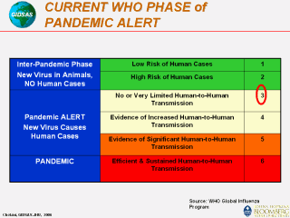 1968, when the last of the previous century's three pandemics occurred. WHO uses a series of six phases of pandemic alert as a system for informing the world of the seriousness of the threat and of the need to launch progressively more intense preparedness activities. The designation of phases, including decisions on when to move from one phase to another, is made by the Director-General of WHO. Each phase of alert coincides with a series of recommended activities to be undertaken by WHO, the international community, governments, and industry. Changes from one phase to another are triggered by several factors, which include the epidemiological behavior of the disease and the characteristics of circulating viruses. The world is presently in phase 3: a new influenza virus subtype is causing disease in humans, but is not yet spreading efficiently and sustainably among humans. |
