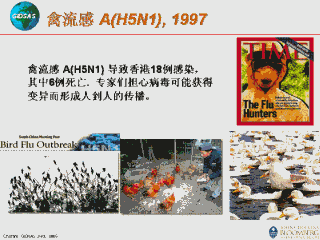 在1997年5月到12月之间,一个新的A型流感病毒H5N1出现在香港,引发18例感染,其中6例死亡。感染病例遍布整个特区。在1997年3月到5月间,病毒在3个养鸡农场被检测到,导致6800只家禽的死亡。病毒的排除通过隔离和对超过1700万家禽的检测,直接花销6000万美元,间接花销2亿5千万美元(RC6)。由于香港大多数的监控都是在医院进行,因此有可能很多轻微病例没有被识别出。