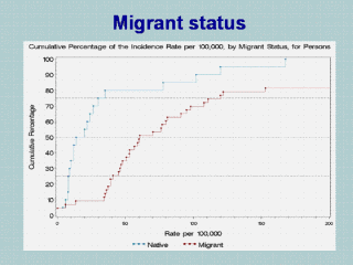 excluded from the analysis because of overlapping by time and place. Overall migrant groups displayed elevated prevalance of schizophrenia compared to their native-born populations. The migrant to native-born rate ratio median (10% to 90% quantiles) was 4.6 (1.0 to 12.8). Differences were statistically significant. |
