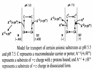 Figure 6. A simple postulate to explain the behavior observed in Figure 5. At low pH, the transport proteins for these acidic substrates functions as postulated. The protonated weak acid binds to the transporter, and once released inside, alkaline internal pH causes dissociation of the acid and accumulation of the anion. At high pH, however, the transport protein functions in an electrogenic mode due to an important functional group with a pK below 7.5. In this manner, at high pH, these transport proteins would function like those for neutral substrates. That is, the acidic substrate with a bound proton(s) (i.e., the undissociated form of the acid) plus another proton bound to the postulated functional group in the transporter would translocate the protonated acid with a additional proton, and accumulation would become electrogenic and driven by DY. |