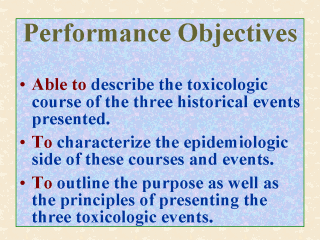 completely filled with toxicology studies alone. In addition, students should contrast the various impacts made by the epidemiologic information on these toxicologic events, and be able to conceptualize the difference in these impacts. Insofar as the same type or the same level of epidemiologic information is not always needed or readily attainable, the importance and relevance of epidemiologic information to a toxicologic event necessarily varies with the situation involved. Finally, students should be able to appreciate the purpose for which the three case studies were presented in this lecture. There are numerous toxicologic events in history. The case studies were purposely selected to represent certain important concepts and principles which were highlighted in the slides labeled The Lesson (that to be learned). |