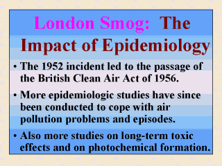 smokeless fuels could be burned. Initially most studies on adverse health effects of air pollution had a focus on short-term changes in incidence associated with places where coal had been widely used for domestic heating and industrial purposes. According to Maynard and Waller (1991), epidemiologic studies (e.g., Martin and Bradley, 1960) subsequent to those for the London smog of 1952 continued to show a fair correlation between smaller increases in daily deaths in Greater London and more modest episodes of high pollution like smoke and sulfur dioxide. Further epidemiologic studies related to major air pollution episodes were summarized in Maynard and Waller (1991), Costa and Amdur (1996), and Elsom (1996). Since the conduct of these acute epidemiologic studies, especially those on the 1952 incident, chronic effects of the major air pollutants have become an equally important subject matter to inhalation toxicologists. This series of acute epidemiologic and chronic toxicologic studies eventually led to a better understanding of the formation of photochemical (summer) smog. Summer smogs are major air pollution problems currently encountered by many traffic-congested megacities like Los Angles, Mexico City, and London. |