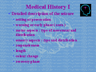 Before the attack : Was there lack of sleep or unusual stress ? Was there any recent illness ? Had the person taken any medications or drugs ? What was the person doing immediately before the attack :lying, sitting , standing , getting up from a lying position , heavy exercise? During the attack : How did it begin ? Was there a warning ? Were there abnormal movements of the eyes , mouth , face , head , arms , or legs ? Was the person able to talk and respond appropriately ? Was there loss of urine or feces ? Was the tongue or inside of the cheeks bitten ? |
