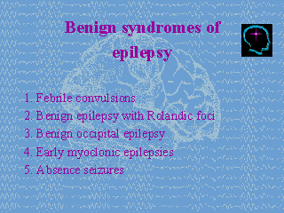 in children who have no risk factors . Benign epilepsy with Rolandic foci: has an onset between 2 and 12 years, is maximal between 7 and 10, and stops by 13 years. The attacks are clonic , partially sensorimotor affecting the face, bulbal muscles, hand, and arm, and they occur particularly on waking . Benign occipital epilepsy: some children with typical partial seizures with visual phenomena, postictal headache, and migrainous characteristics have a benign prognosis, but others have a poorer cognitive and seizure outcome, and some have lesions . Early myoclonic epilepsies: separation of early myoclonic epilepsies into benign and malignant outcomes may not be possible early . Absence seizures: range from a benign self - limiting condition to part of a malignant syndrome of multiple seizure types, particularly the Lennox - Gastaut syndrome. The rate of tonic-clonic seizures in adult life, can be predicted by the expected adverse factors: history of tonic-clonic seizures, IQ< 90, and a family history of seizures. Seizures continue in about 10% of cases with no adverse factors or only one and in 100% of cases with three adverse factors. |
