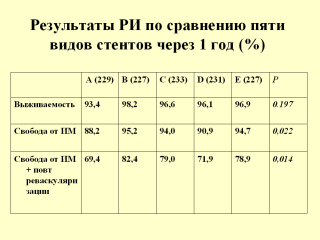 в области имплантации стентов. Это исследование выявило определенные различия в отдельных клинических исходах при использовании стентов разных фирм, но все различия были статистически незначимы. |