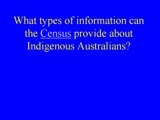 In addition to providing the basis from which population estimates and projections are developed, the Census provides a variety of useful information about the Indigenous population. The Census is also one of the few collections that provides information for small areas. However, the usefulness of the Census for monitoring the health and welfare of the Indigenous population is limited because new data are only available every five years, and because it does not collect the broad range of health data required. The following slides show some information from the 1996 Census. |