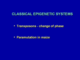 | The two classical epigenetic phenomena that were first characterized genetically in maize are changes in the activity phase of transposable genetic elements, identified and described by Barbara McClintock, and paramutation, described by Alexander Brink and his students. Although McClintock is widely credited with the discovery of transposition, it is less widely appreciated that she was also the first to describe and analyse an epimutations, although she certainly didn’t call them that. |