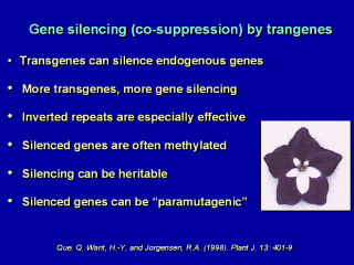 it could be silenced throughout the plant. Similar observations were subsequently made by many investigators for many different transgenes. It appears that a certain fraction of transformants derived by the commonly used Agrobacterium transformation technology exhibit what has come to be called gene silencing or co-suppression. What this means is that if an extra copy of a gene already present in the genome is introduced, both the endogenous and the introduced copies are silenced together, hence the name “co-suppression.” But the gene silencing is not confined to endogenous genes. A transgene can be silenced, as well, and the probability that it is silenced increases with the number of copies. The salient features of co-suppression are these: 1. The probability of inactivation increases with copy number 2. The copies can be tandem direct repeats or inverted repeats and inverted repeats are more effective than direct repeats. 3. Silencing can be heritable, but isn’t always. 4. A silenced multicopy locus can be “paramutagenic,” meaning that it can transfer its “silenced” state to another allele of the gene located elsewhere in the genome. |