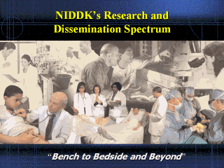the public. Efforts include: -Identification of health problem -Epidemiologic & basic research to identify potential risk factors, mechanisms, & influences -Clinical trials to determine efficacy of novel therapies on health outcomes -Translation of research from the bench to the bedside, and back -Dissemination of information through national education programs The Institute aims to move advances in basic science, achieved at the “bench,” into trial of novel therapies in patients at the “bedside.” The NIDDK also strives to use knowledge gained during such trials to fuel future laboratory studies. |