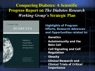 research opportunity:” -Genetics of Diabetes and Its Complications -Autoimmunity and the Beta Cell -Cell Signaling and Cell Regulation -Obesity -Clinical Research and Clinical Trials of Critical Importance Pictured above is the cover of an NIDDK report on progress made in implementing the recommendations of the DRWG. The full report is available at http://www.niddk.nih.gov/federal/dwg/2002/dwg02.htm |