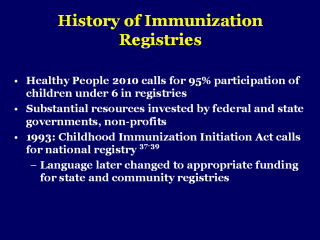 | Considerable effort has been put into developing immunization registries over the past decade, including major funding from the CDC and HRSA, state health departments, and the Robert Wood Johnson All Kids Count program. |