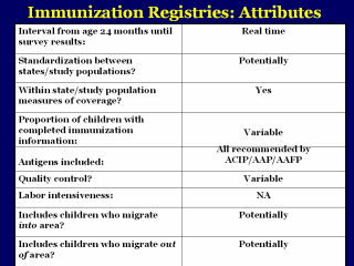 This table summarizes the attributes of immunization registries in measuring immunization coverage.