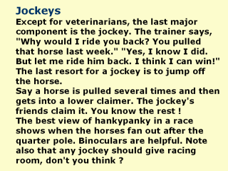 Dancer got pulled by steering him all over the track (no brakes were used). Lots of early mornings, Native Dancer would throw John the exercise boy off, then wait for him to get on again. This proves that horses have a sense of humour. |