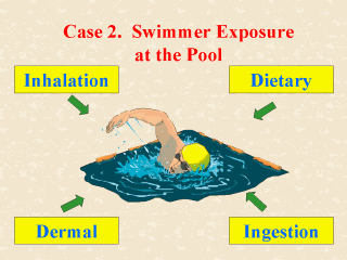 that need to be treated with one or more water disinfectants. In addition to drinking water or other sources as a potential, people can be exposed to the water disinfectants from being in or at these pools and spas. Although somewhat exaggerated by the U.S. EPA, the possible routes of swimmer exposure that can be considered are characterized in their assessment model developed specifically for this type of exposure potential. In their model, known as the Swimmer Exposure Assessment Model (SWIMODEL), the U.S. EPA provided algorithms for calculating the exposures from 7 potential routes of entry for swimmers in or at pools and spas treated with water disinfectants (Dang, 1996). The 7 routes of entry are: (1) the greater skin surface proper; (2) oral/drinking of pool water; (3) inhalation at the pool; (4) the buccal/sublingual area; (5) the orbital/nasal area; (6) the aural area; and (7) the sexual organ area. Upon a careful review of the parameters involved, Dong and Ross (in press) denounced the significance of the last four routes. Yet despite such a denouncement, at times the dermal uptakes via the last four routes can be as potential as the oral intakes from food and drinking water, or as the inhalation of ambient air away from the pool. |