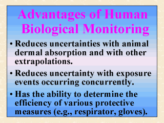 extensively in Ross et al. (2000). Because HBM integrates the exposure by all routes of entry, this type of studies also reduces the concern about exposure events that may occur concurrently or those that cannot happen at the same time. As Bernard and Lauwerys (1987) put it, "Biological monitoring also takes into account all the physicochemical and biological variables that influence the uptake or the absorption, such as the ventilatory parameters, particle size distribution, and individual variability in absorption and metabolism." As further implied in the work by Brouwer at al. (2001), HBM can be used to more effectively determine the efficiency of various protective measures such as gloves, masks, and coveralls, by comparing the overall exposures monitored with and without the use of any one of the protective measures. |
