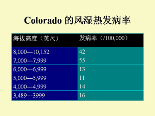 随着海拔高度以英尺为单位上升,风湿热的发病率也随之上升。有趣的是,一些其他的自身免疫疾病也与海拔高度有一定的关系。