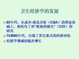 威廉·配第爵士(17世纪)曾估计过在?0至?0之间的一个人生活的价值。维多利亚女王时代,推动公众卫生运动的先锋诸如威廉姆·法尔(1807-1883)等的著作提出了关于经济增长和工人健康之间关系的论题。法尔提出了评估生产力降低的人力资本法的一个早期版本,即将一个人的货币价值作为他计划的将来收入的目前价值,并减去维持日常生活所需的费用。这个他在流行病期间用来计算卫生保健的粗略利益的值不可避免的暗含着为特殊政策鼓吹的意味。然而,在上上个世纪的后半叶和上个世纪的前半叶,经济学家几乎没有注意到卫生保健资源利用方面的问题,现代的卫生经济学起步于1950和1960年代。在50年代,著名的美国经济学家,如肯尼斯·阿罗和米尔顿·弗里德曼,已开始研究经典的经济学理论在卫生保健上的应用,特别是两个方面的用途:协助制定如何分配资源的决策以及作为社会改革的载体。