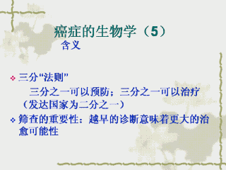 癌症的生物学对癌症治疗有重要的含义。在细胞水平是缺陷基因控制的问题,其正在本质上就是遗传的严重失调。但是遗传性的癌症如视网膜母细胞瘤并不常见。相反,癌症常常是由于外界影响而获得的,这就是说,它是潜在的可以避免的。利用当前的方法,理论上可以避免2/3的癌症,但实际上大概1/3可以避免。在发展中国家,1/3的癌症可被治愈,在发达国家,这个数字接近于1/2。