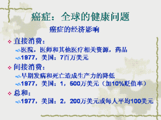 癌症对一个国家的经济负担,如图所示,为1977年美国直接和间接的消费。直接的消费大约为7百万美元,间接的为一千五百万美元,总和为两千两百万美元或平均每人100美元。直接的消费像医院、护理和药品可以被合理的估计。可以向患者提供确切的费用。间接的消费体现在生病和早死造成的劳动力丧失。这很难估计,因为这基于对未来估计的期望以及未来美元的贬值情况。在研究中假定贬值率为10%。