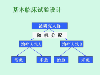 在基本的临床试验设计中,患有某一特定疾病或拥有研究者感兴趣的某一特征的病人被随机分配治疗方法,接着进行随访以确定各治疗组中达到某一事先预期结局的比例。结局可以是“治愈”或疾病缓解、死亡、或许多其它结局。最终的目标是:推断这一治疗方法在研究对象所代表的人群中的效力。