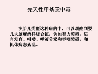 甲基汞中毒的胎儿类型据说比成人要严重的多,伊拉克的甲基汞中毒与日本的熊本县中毒不同,在熊本县22个有严重脑失调的婴儿的母亲表现轻微或没有症状,然而在伊拉克的事件中,在25对母胎中只有一个母亲没有表现症状。
