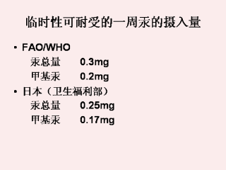 1967年,FAO/WHO食物添加剂专家委员会建议,任何能增加食物中汞含量的化合物的使用应该坚决抵制,瑞典专家团研究发现全血中0.2mg/g的汞的浓度和头发中60mg/g浓度能出现人体汞中毒的症状。这些浓度水平可能与普通人平均每天摄入0.3mg的汞(甲基汞)。安全系数为10时,平均每天0.03mg甲基汞