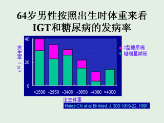 教授研究证明:在英国老年男性中IGT与糖尿病的发生率与出生时体重是相反的。他们提出子宫内环境和早期生活决定后来生活中糖尿病的发生。他们推测低出生体重儿胎儿时期营养不良,对胰岛素分泌和代谢产生干扰,导致后来的代谢异常、胰岛素抵抗综合征,以及糖尿病。